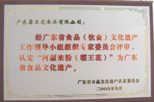 2009年11月20日,“第二批廣東省食品(飲食)文化遺產保護名錄新聞發布會” 在廣州召開。省文化廳杜佐祥副廳長和省食品行業協會張俊修會長、省經信委、省文物局等相關領導,以及文史專家、食品專家、企業代表,南方日報、羊城晚報、廣州日報、廣東衛視、南方電視臺、廣東電臺、《食經》雜志等省內主要新聞媒體記者,共110人出席了新聞發布會。發布會上,廣東省食品文化遺產認定委員會文史、文物專家、廣州博物館名譽館長麥英豪研究員宣讀了《關于公布廣東省食品(飲食)文化遺產保護名錄(第二批)的決定》,并對22家企業頒發了牌匾和證書。其中,我司申報的“河源米粉(霸王花)制作工藝”,因其科學地將傳統制作工藝和現代食品生產工藝有機結合,形成鮮明的嶺南食品文化特色,被成功列為我省食品文化遺產保護名錄,這是“河源米粉(霸王花)”在品牌保護上繼成功申報國家地理標志保護產品、嶺南特色食品之后獲得的又一殊榮。